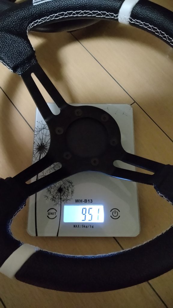 話が変わりますがステアリング重さを計ってみました。まず純正ステアリングですね。重さ1173gでした。多少の前後はあると思います。
